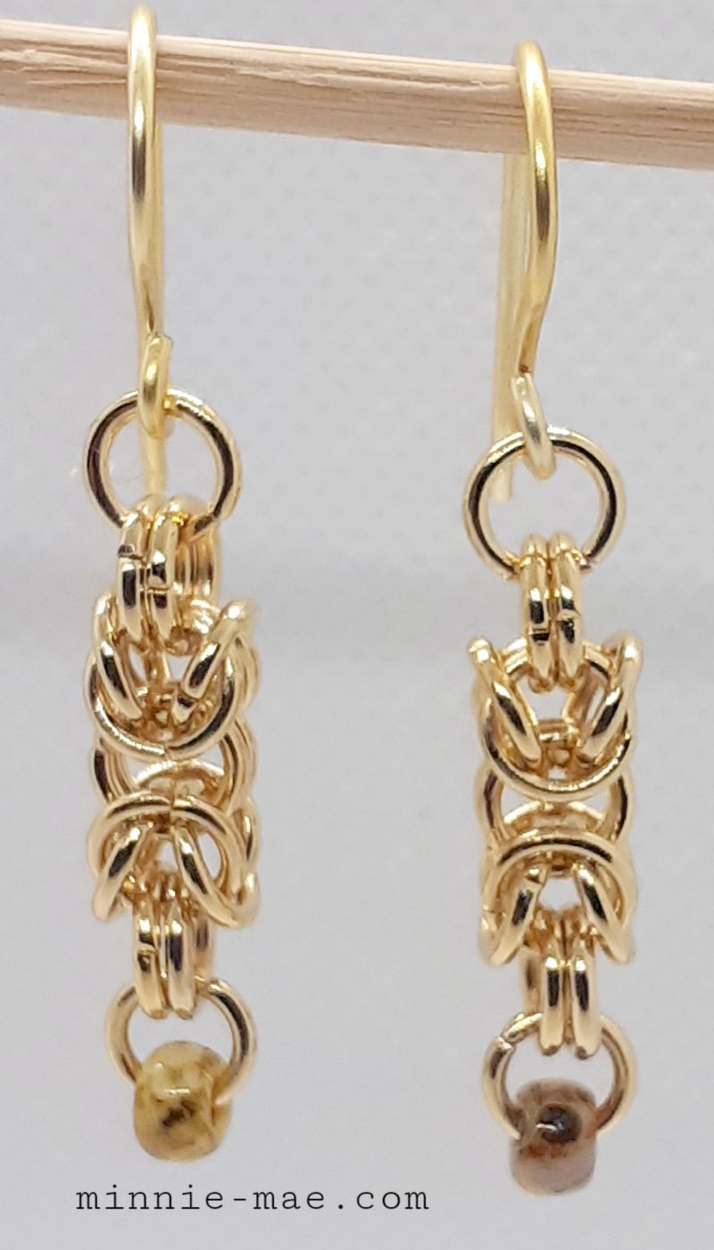 Golden Stainless Steel rings - Byzantine weave, with a small Japanese Miyuki bead. These earrings feel beautiful to wear, they are smart and light on your ears. Approx length 30mm.