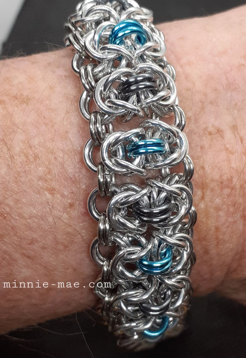 Silver bright aluminium with Blue and Gunmetal anodized aluminum rings and Stainless Steel ring - Byzantine Ladder weave. This bracelet feels beautiful to wear, it's chunky and the stainless steel gives some weight but not too much. It has a handmade clasp from silver coloured wire. Please email shop@minnie-mae.com with the length you would like this bracelet.