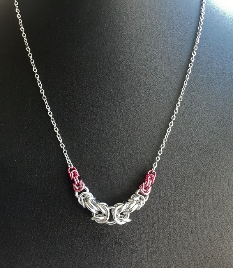 A section of graduated byzantine weave. With silver Bright Aluminium to pale pink and then rose pink anodized aluminium on a fine stainless steel chain with stainless steel lobster clasp.