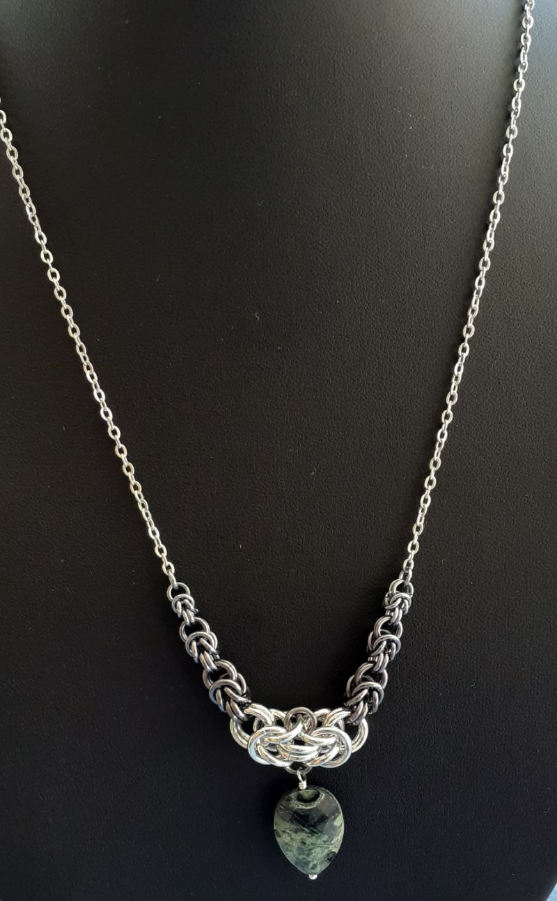 A section of graduated byzantine weave. With a 'polar jade' tear drop. With silver Bright Aluminium to gun metal grey anodized aluminium on a fine stainless steel chain with stainless steel lobster clasp.