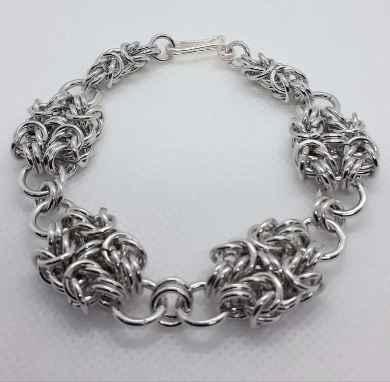 Beautiful Byzantine Bracelet. Bright Aluminium 1.2mm (ring size). A lovely bracelet to wear as it's light with a heavy look. With the byzantine sections doubled and broken up to give a lovely flower effect. The clasp is handmade and easy to do up. I can reduce the size for smaller wrist size, see photo with ruler for approx sizing in mm. Shown for approx length with mm ruler.