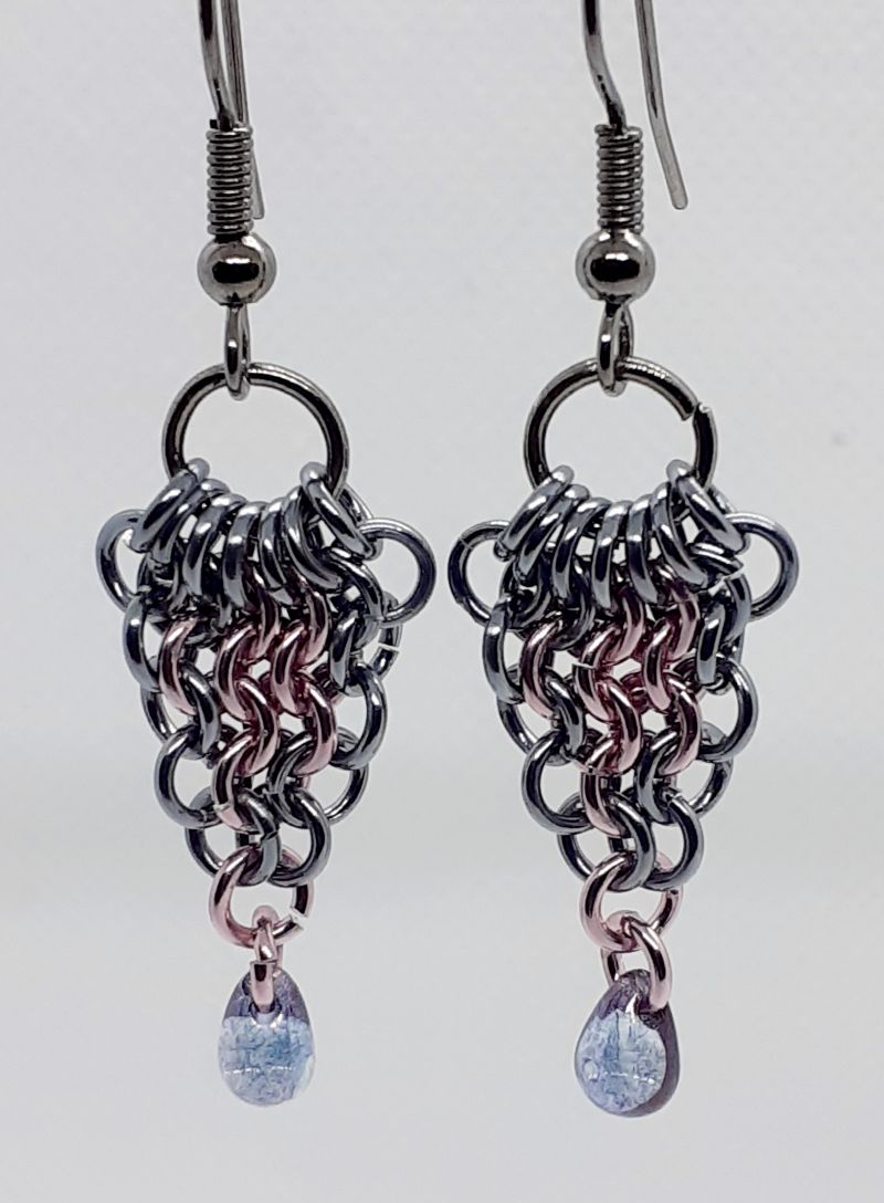 Micro chain maille with ring size <3mm, in gunmetal and Pink anodized aluminum rings - European 4 in 1 weave. These are small dainty with a lovely little pink/blue Czech glass teardrop bead. Shown for approx length with mm ruler in photos.