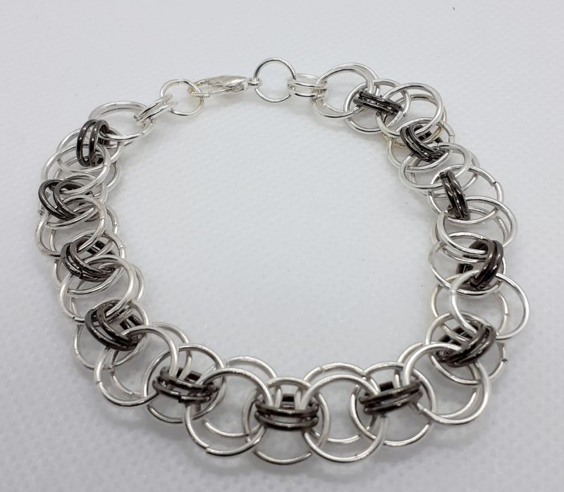 Lovely loose and light Helm weave chain maille bracelet. Gunmetal and silver coloured rings.