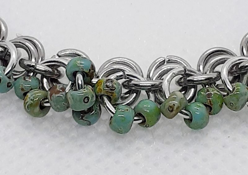 2 in 1 stainless steel chain maille bracelet. 1mm (ring size), with small Japanese Miyuki teal coloured beads, joined with Aluminum rings to each one ring section. There's some weight in this fine bracelet and the beads move with your wrist. The clasp is handmade coated 1mm wire, which is easy to do up. See photo with ruler for approx sizing in mm. Shown for approx length with mm ruler.