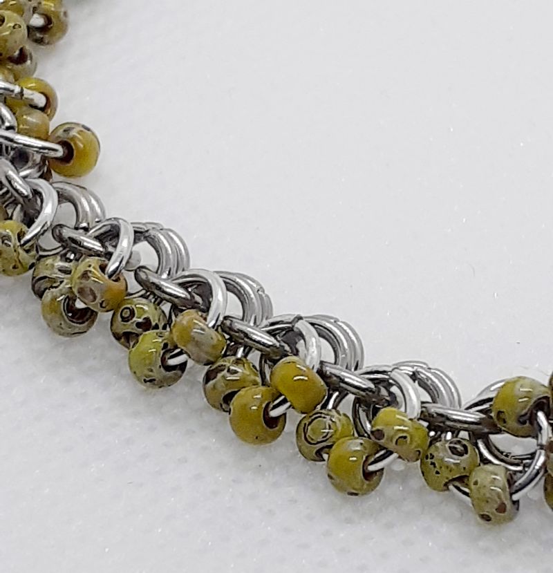 2 in 1 stainless steel chain maille bracelet. 1mm (ring size), with small Japanese Miyuki olive coloured beads, joined with Aluminum rings to each one ring section. There's some weight in this fine bracelet and the beads move with your wrist. The clasp is handmade coated 1mm wire, which is easy to do up. See photo with ruler for approx sizing in mm. Shown for approx length with mm ruler.