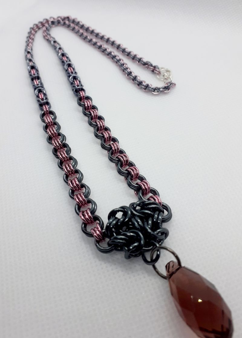 Flamingo Necklane 2 in 1 and byzantine weaves. This necklace graduates from 1.2mm rings, to 1mm then 0.08mm byzantine weave and then 0.08mm 2 in 1 weave all in pink and grey. The pendant centre piece is 1.2mm grey byzantine with a czech glass tear drop. Approx 20cm length to top of teardrop, which is approx 2cm long.