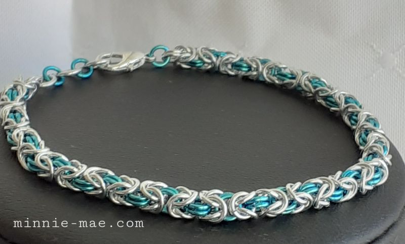 Fine and feminine Byzantine Bracelet (micro-chain maille). Bright Aluminium (BA) 0.08mm (ring size), with Anodized Aluminium 'blue' coloured rings. A lovely bracelet to wear as it's light approx 3g. With an aluminium lobster clasp. Length approx 200mm, if you want smaller please email length before posting.