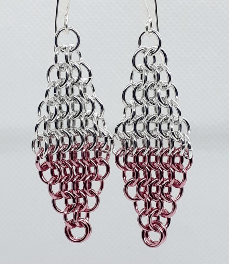 Silver bright aluminium and Pink anodized aluminum rings - European 4 in 1 weave. These earrings feel beautiful to wear, they are smart and light on your ears. Approx length 40mm.